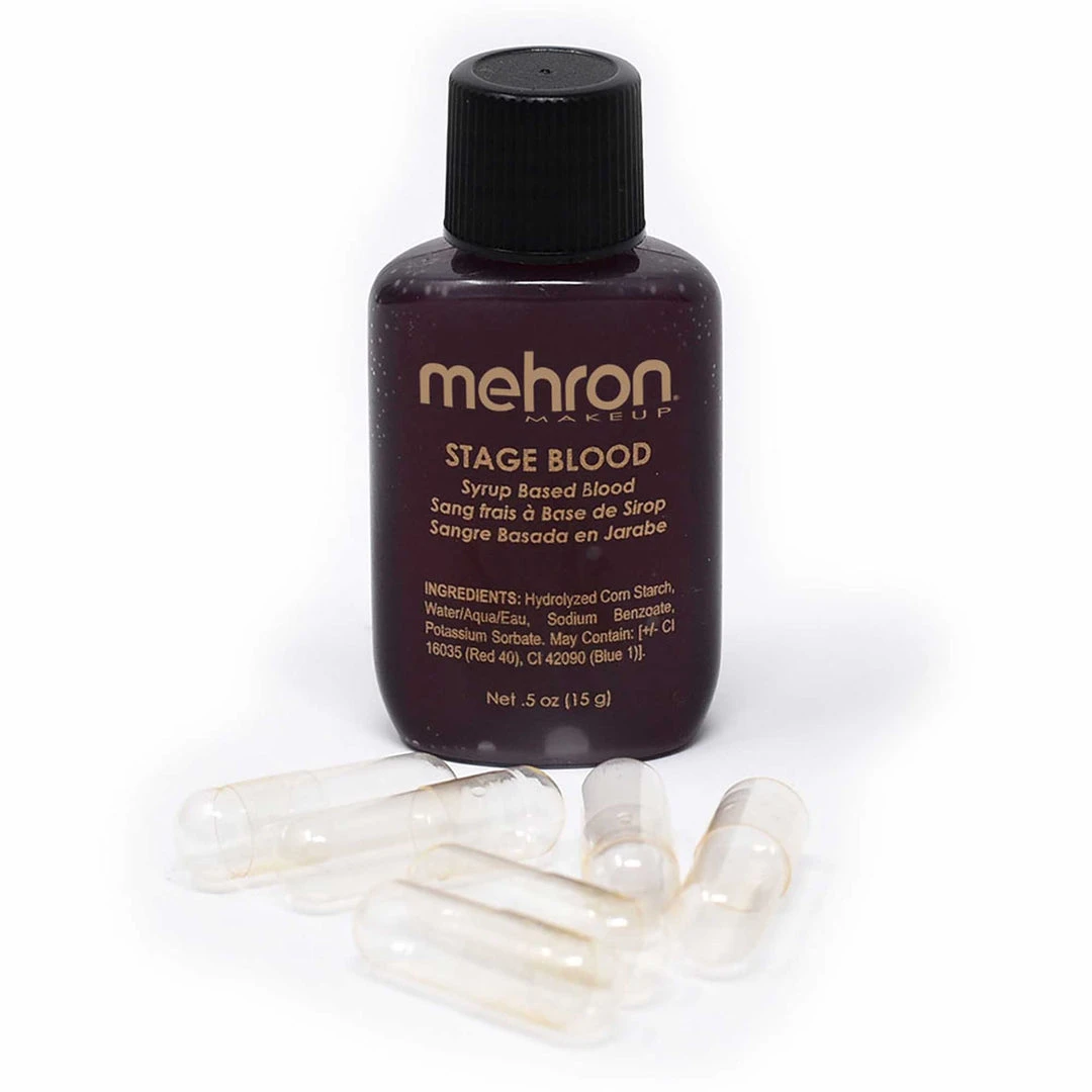 A classic syrup-based formula blood by Mehron; Stage Blood was developed for a realistic theatrical appearance both for stage and film. This product includes 6 fillable gelatine blood capsules and 0.5 fl oz of Bright Arterial Stage Blood.