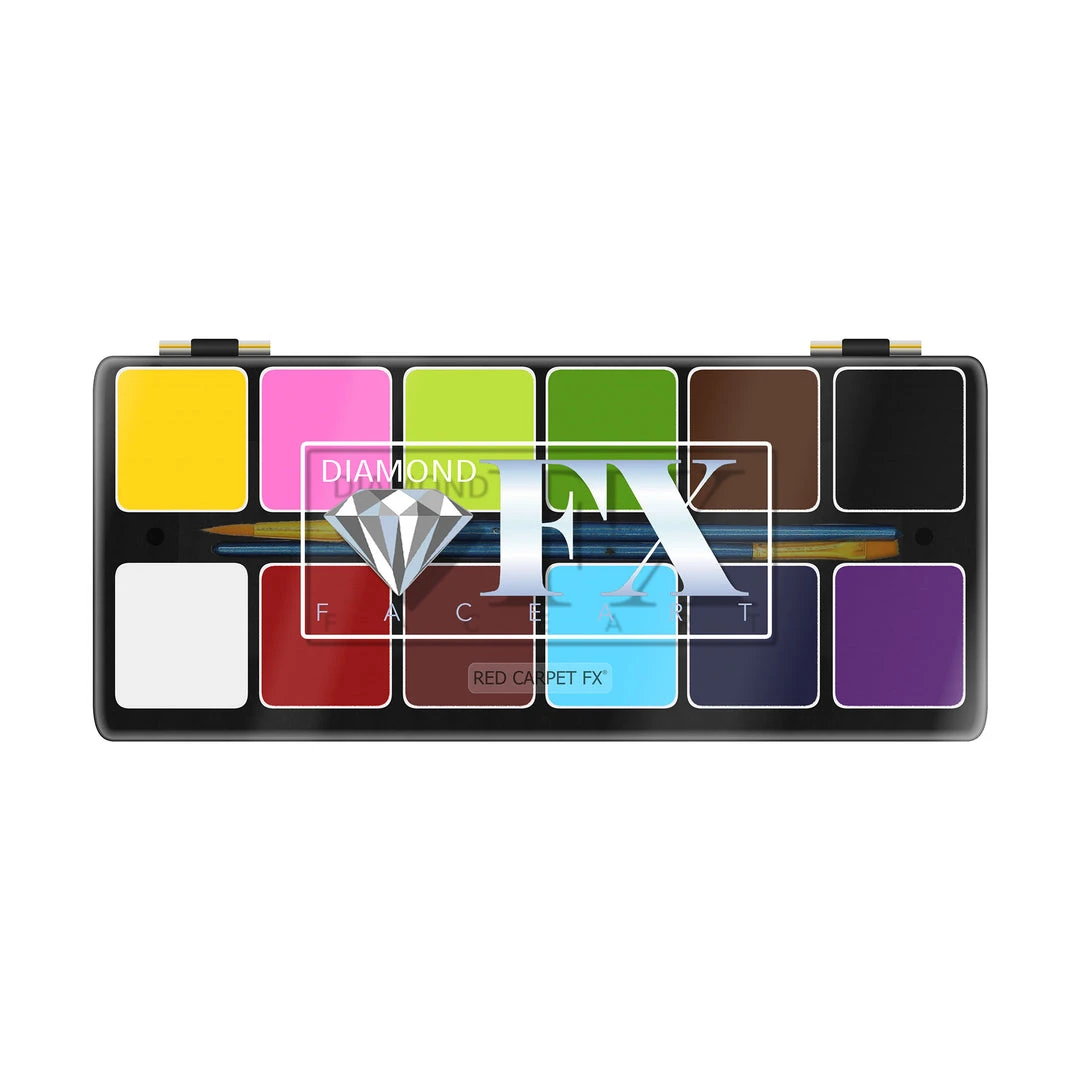 The Diamond FX Essential 12 Palette contains 12 colours that are ideal for all face & body painting applications. Containing a full spectrum of colours including yellow, pink, greens, brown, black, white, reds, blues and purple.
