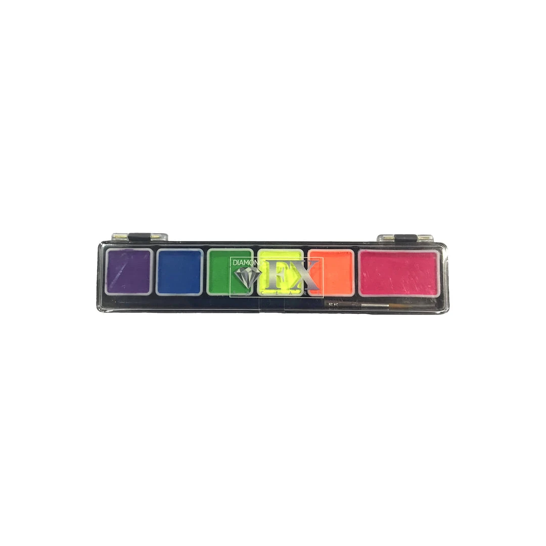 The Diamond FX Neon 6 Colour Mini Palette contains the ultra vivid primary colours. It contains 5 x 3g colours in purple, blue, green, yellow and orange as well as one double size 6g hot pink. Also contains a high quality round fine tip brush. Ultra vivid colours that glow in UV/blacklight.