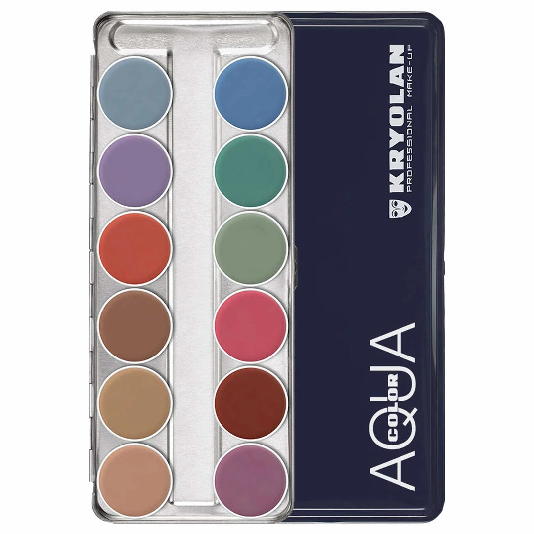 Here is the 12 colour P Palette in Kryolan AQUACOLOR; a glycerine based, water activated make up that is highly pigmented, with superior quality ingredients to its competitors. AQUACOLOR is universally applicable, primarily as a make up for face and body painting, but used in beauty applications too.