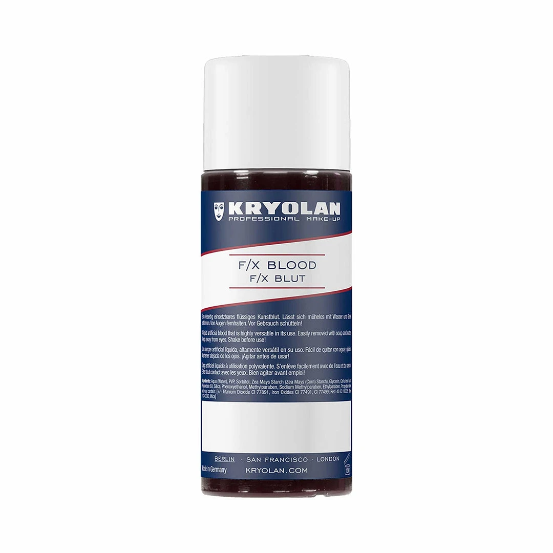 Kryolan FX Blood is an artificial liquid blood that is highly versatile. It completely dries on the skin, making it completely smudge proof. Its unique formula, unlike other artificial bloods does not stain the skin, and can be removed easily with soap and water. However, even though it dries completely, it still maintains its sheen making it still appear fresh with a moist impression.