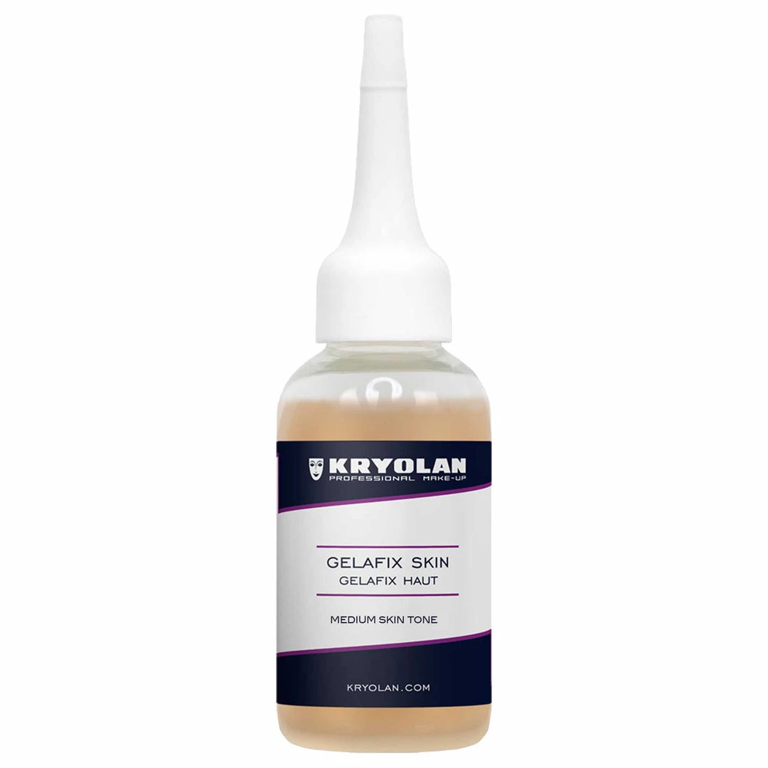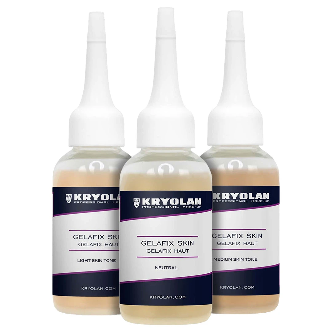 Gelafix Skin is first heated in the supplied bottle in a water bath or just very short-time in a microwave until the material has melted. Pour the contents onto a plate or blending palette, check the temperature of the material and then apply it quickly to the skin with a spatula. After drying, lightly apply a translucent setting powder and then use a greasepaint to provide the required design and once again set with powder. The moist effect of a fresh burn wound can be simulated by using a transparent jelly. To remove simply peel from the skin and use plenty of warm water to rinse.