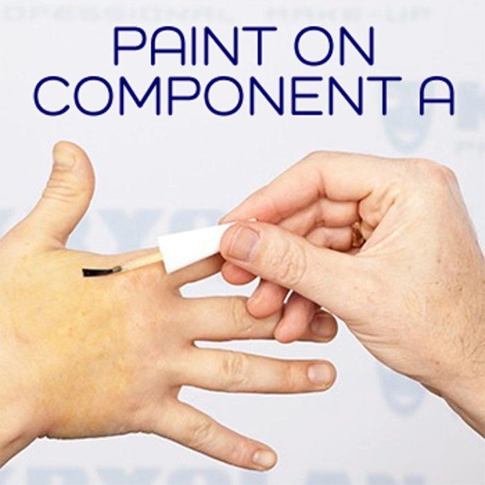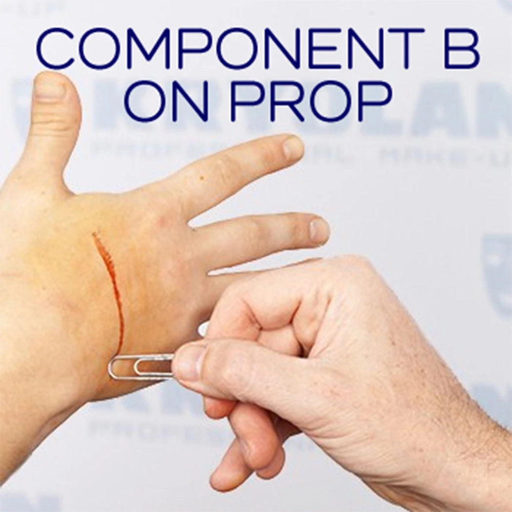 Apply component A and allow to dry thoroughly. Component B must touch the first component when wet. Immediately the blood effect sets in leaving a cut effect.
