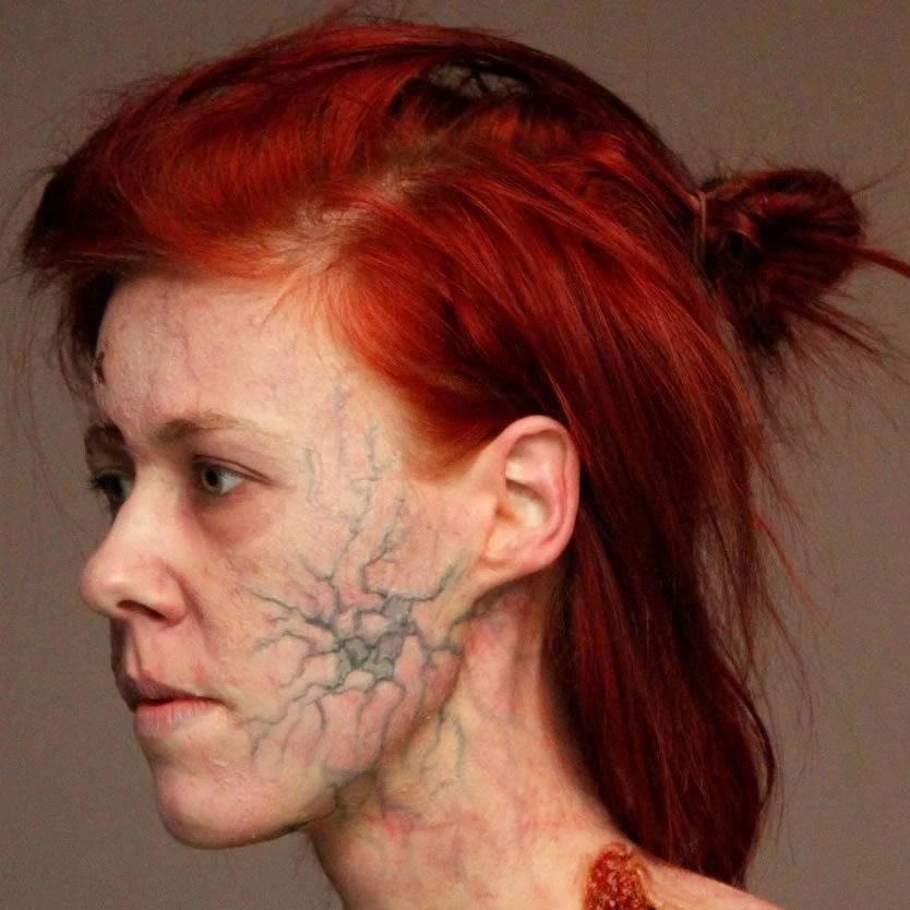 To apply the silicone version of this prosthetic, simply remove from packaging and place the prosthetic on a cleanable surface (such as a stainless steel palette). Clean the area of the skin on the desired area of appliance application; use a product that will remove excess oil from the surface of the skin (such as an alcohol based product); this will enhance the bond. Apply a silicone adhesive (such as Kryolan Silicone Adhesive) to the contact side of the prosthetic evenly and in small quantity. Apply the same adhesive to the appropriate area of skin. Allow plenty of time to dry (this is important, because any adhesive that is not dry before application will remain uncured, bubble and not bond). Once the adhesive is dry to the touch, apply the prosthetic to the area of skin; press the prosthetic in the centre, keeping the edges up (if possible) to make sure all air is removed, gently pressing down the prosthetic, working outwards. Once fully applied, apply even, high pressure to ensure the silicone adhesive is fully bonded.
