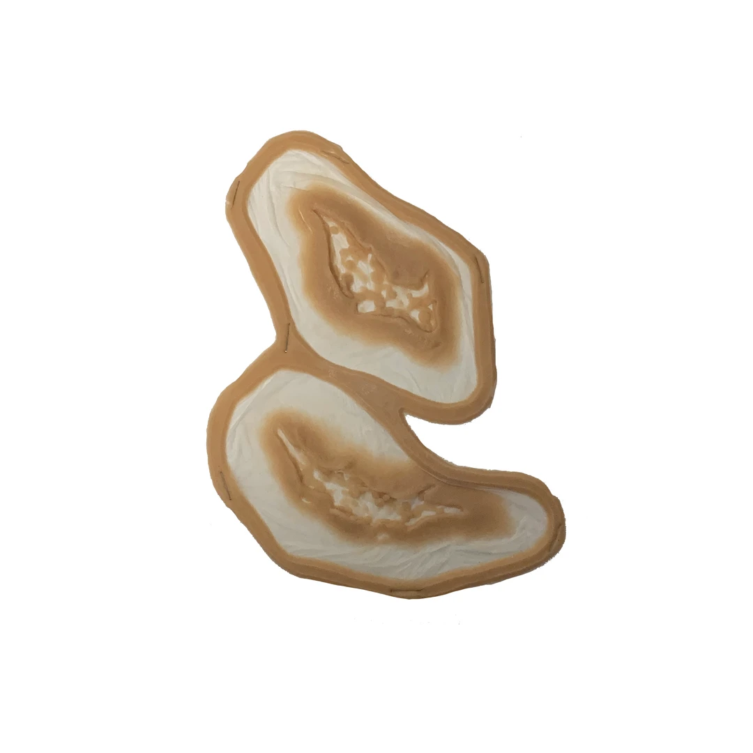 To apply the silicone version of this prosthetic, simply remove from packaging and place the prosthetic on a cleanable surface (such as a stainless steel palette). Clean the area of the skin on the desired area of appliance application; use a product that will remove excess oil from the surface of the skin (such as an alcohol based product); this will enhance the bond. Apply a silicone adhesive (such as Kryolan Silicone Adhesive) to the contact side of the prosthetic evenly and in small quantity. Apply the same adhesive to the appropriate area of skin. Allow plenty of time to dry (this is important, because any adhesive that is not dry before application will remain uncured, bubble and not bond). Once the adhesive is dry to the touch, apply the prosthetic to the area of skin; press the prosthetic in the centre, keeping the edges up (if possible) to make sure all air is removed, gently pressing down the prosthetic, working outwards. Once fully applied, apply even, high pressure to ensure the silicone adhesive is fully bonded.