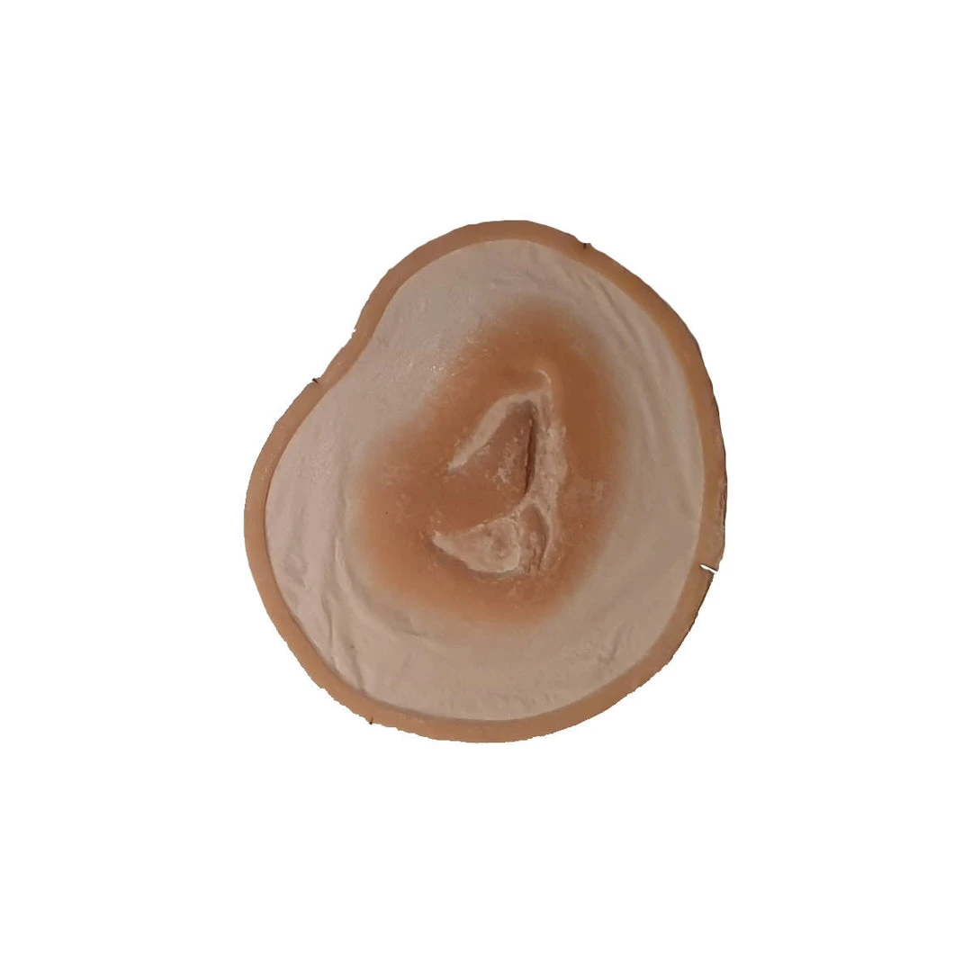 To apply the silicone version of this prosthetic, simply remove from packaging and place the prosthetic on a cleanable surface (such as a stainless steel palette). Clean the area of the skin on the desired area of appliance application; use a product that will remove excess oil from the surface of the skin (such as an alcohol based product); this will enhance the bond. Apply a silicone adhesive (such as Kryolan Silicone Adhesive) to the contact side of the prosthetic evenly and in small quantity. Apply the same adhesive to the appropriate area of skin. Allow plenty of time to dry (this is important, because any adhesive that is not dry before application will remain uncured, bubble and not bond). Once the adhesive is dry to the touch, apply the prosthetic to the area of skin; press the prosthetic in the centre, keeping the edges up (if possible) to make sure all air is removed, gently pressing down the prosthetic, working outwards. Once fully applied, apply even, high pressure to ensure the silicone adhesive is fully bonded.