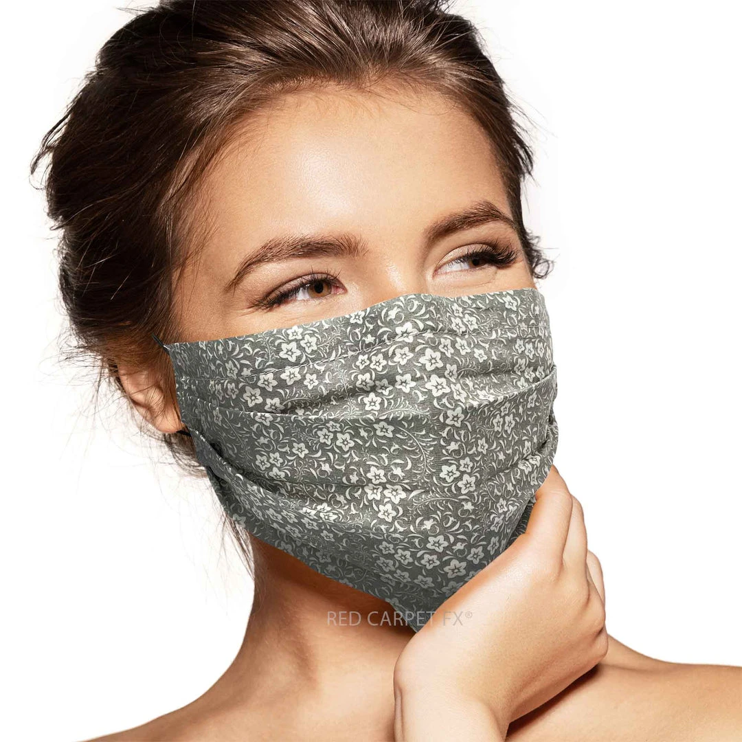 A neat and classy look with a traditional pattern; an intwined off-white floral design on a light grey material. Introducing handmade cotton face masks expertly created by Pebbles of Leeds.