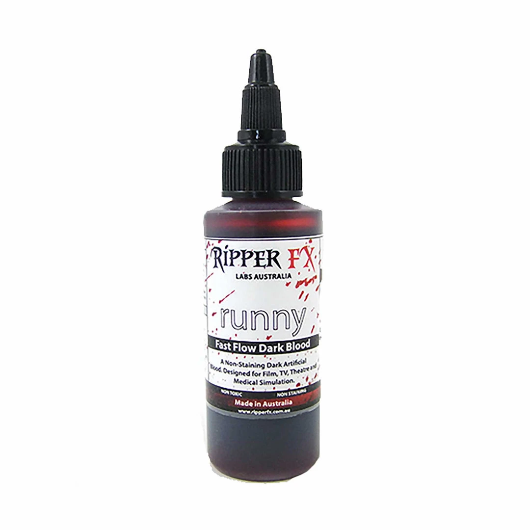 Ripper FX Runny Blood is a quick flowing, lower viscosity blood for realistic dripping blood effects. Colour balanced for HD film it is ideal for professional applications such as television, film, theatre and medical simulations.