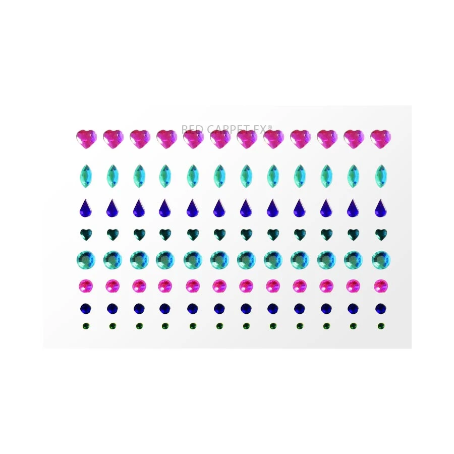 A sheet of 100 multicoloured jewels/gems in an array of different sizes, pastel colours and shapes.