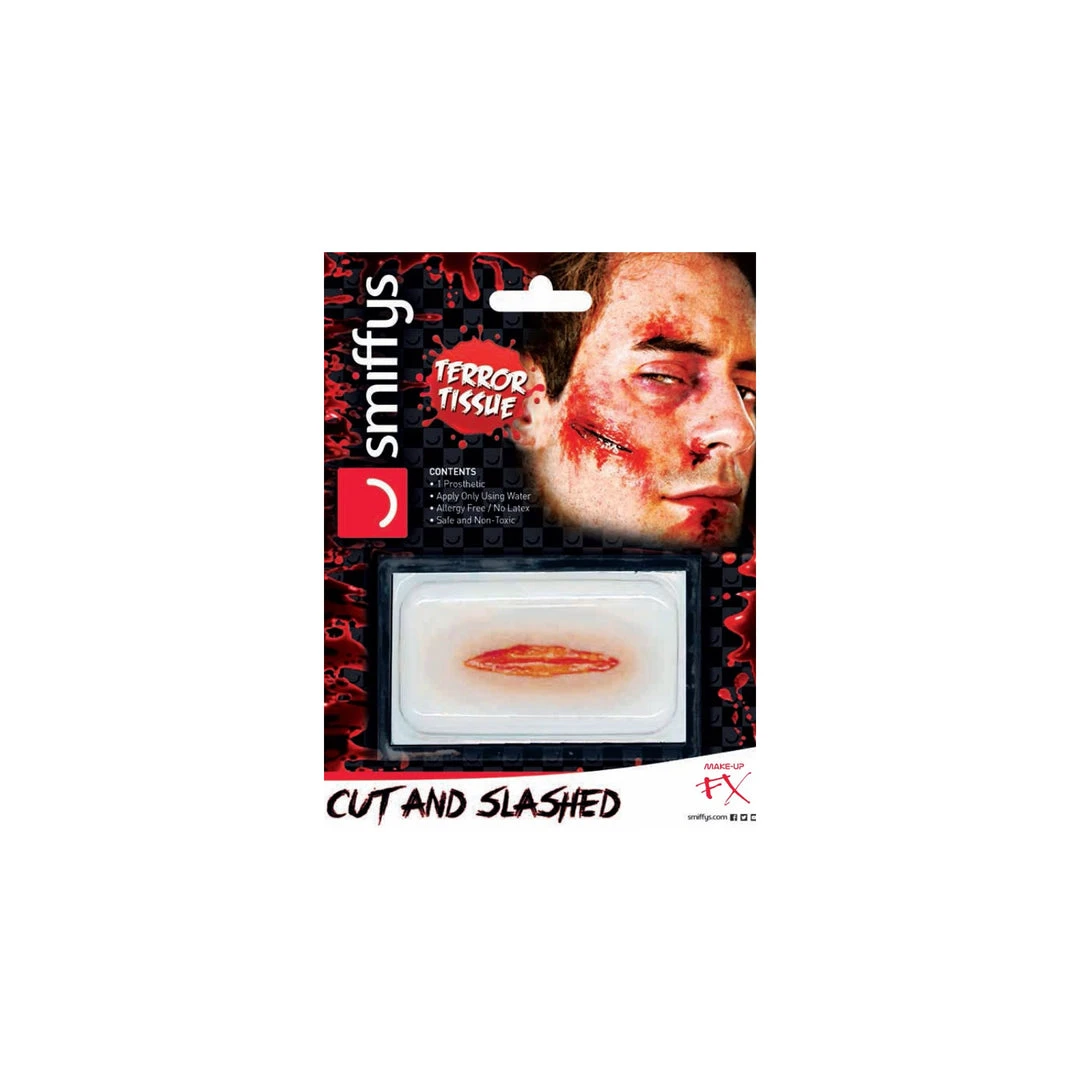 Cut and slash face and body prosthetic that gives a fantastic illusion of visible realistic lacerations to the skin. Smiffys Horror Wounds Transfers are a water-based prosthetic that is applied the same way as a temporary tattoo; simply remove from packaging apply to skin in the desired location with just water.
