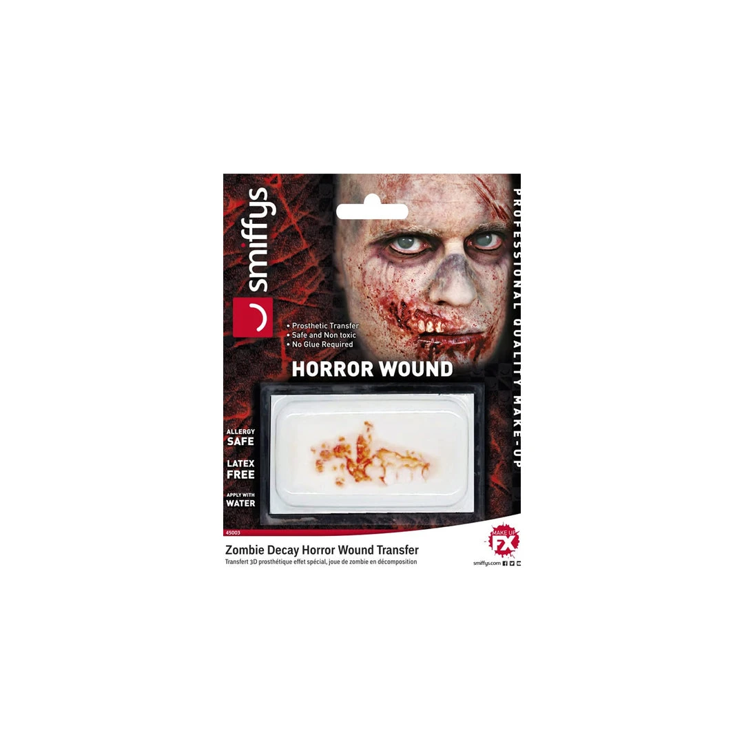 Decaying zombie face prosthetic that gives a fantastic illusion of decayed skin with exposed teeth. Smiffys Horror Wounds Transfers are a water-based prosthetic that is applied the same way as a temporary tattoo; simply remove from packaging apply to skin in the desired location with just water.
