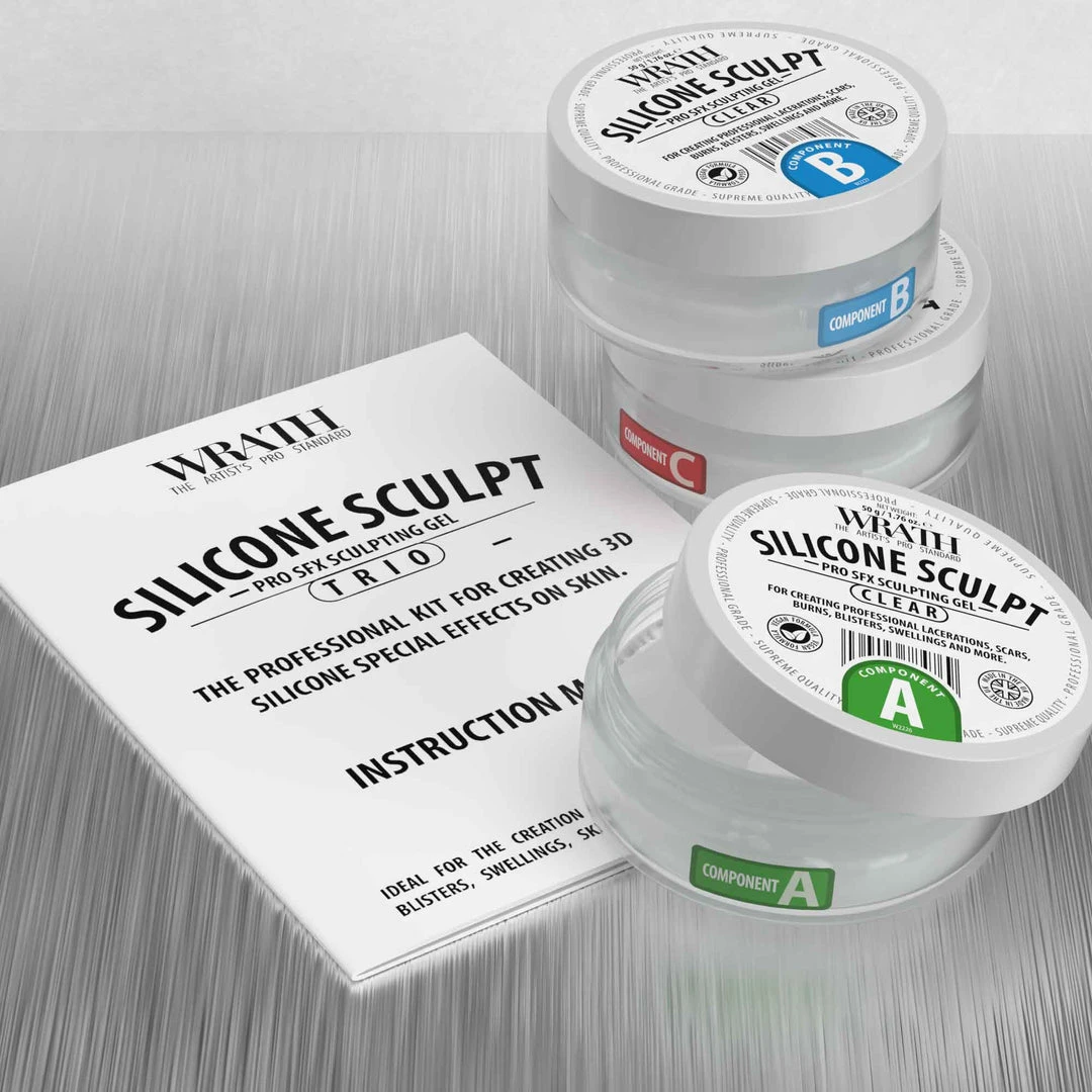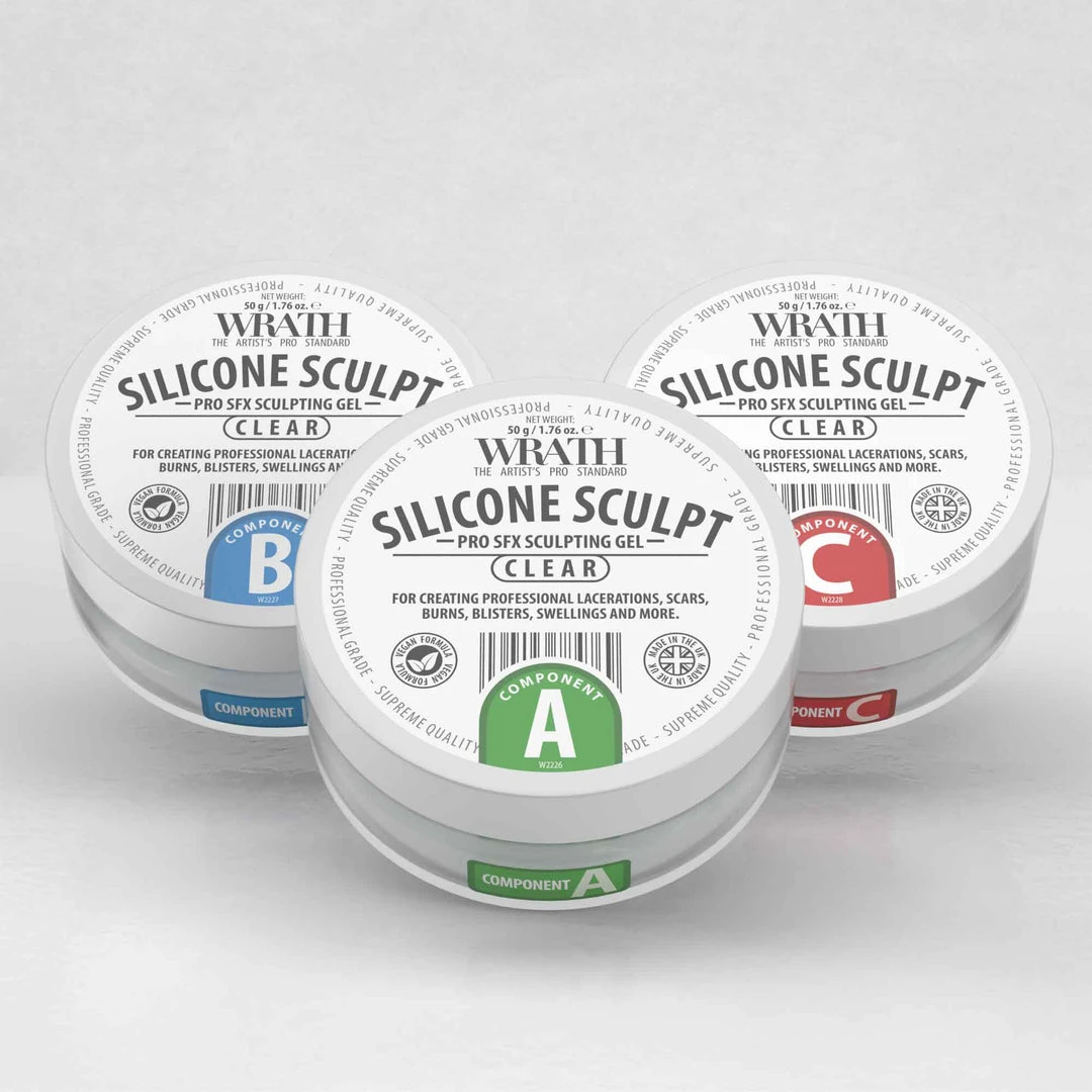 WRATH® Silicone Sculpt Trio is ideal for the creation of burns, wounds, moles and other skin artefacts. It is a two-part (A+B) silicone based gel when mixed together create a flexible & translucent rubber finish. By adding component C, it will soften the cured product, offering more flexibility to desired areas.